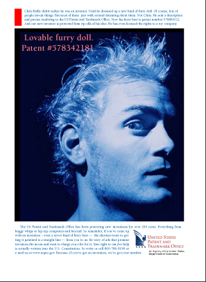 COPY: Chris Reilly didn’t realize he was an inventor. Until he dreamed up a new kind of furry doll. Of course, lots of people invent things. But most of them just walk around dreaming about them. Not Chris. He sent a description and precise rendering to the US Patent and Trademark Office. Now his furry bear is patent number 576894332.
